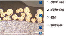 SE-020金属复合边界润滑材料以优质低碳钢为基板,中间烧结球形多孔铜粉层,表面扎制以改性聚甲醛(POM)或聚醚醚酮(PEEK)为主的耐磨润滑材料作为轴承工作层,表面规则的油穴不但可以储存油脂,而且可以有效埋没外部入侵的粉尘,提高了轴承的使用寿命。这种材料具有优异的机械承载能力,中间铜粉层不但可以及时传递轴承运行过程中产生的热量,同时也提高了塑料层与基板的结合强度。以POM或PEEK为主的表面耐磨材料设计适用于油脂润滑工况,轴承表面有规律地排列着用于储存油脂的油穴以保证润滑剂在整个轴承表面的最佳分布。
